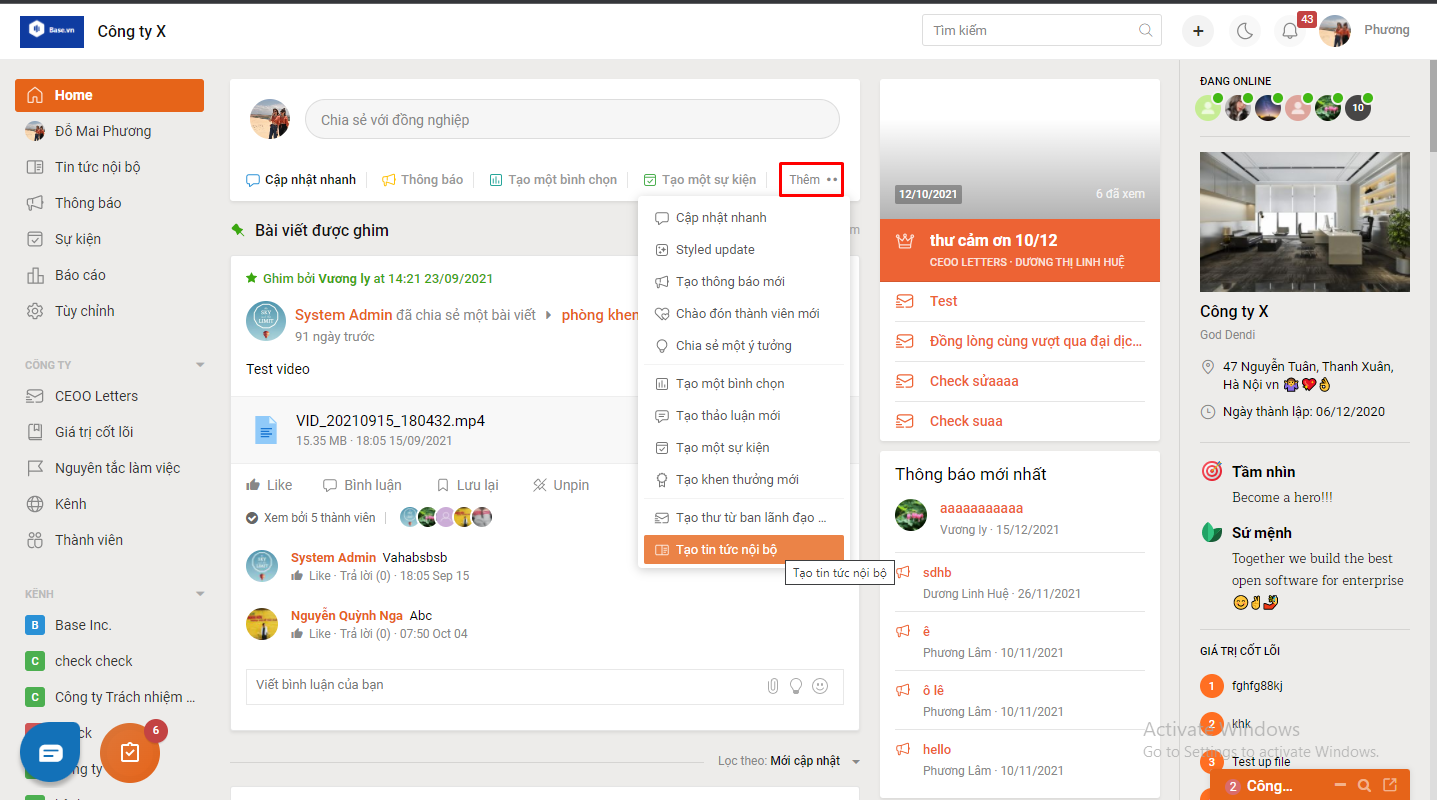 Bước 1: Truy cập vào Base Inside, chọn vào Thêm >> Tạo tin tức nội bộ