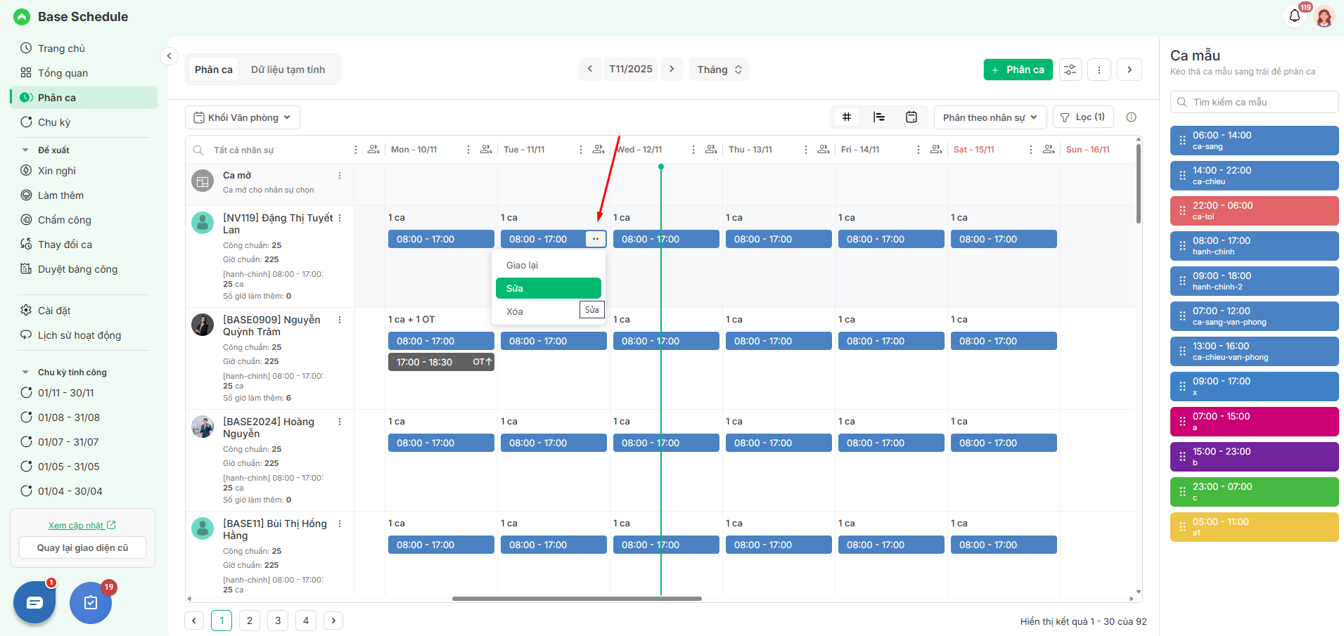 Bạn vào "Phân ca" để sửa lại ca làm việc trước đó nhé: Đưa chuột vào ca cần sửa >> chọn dấu “..” >> Chọn “Sửa”