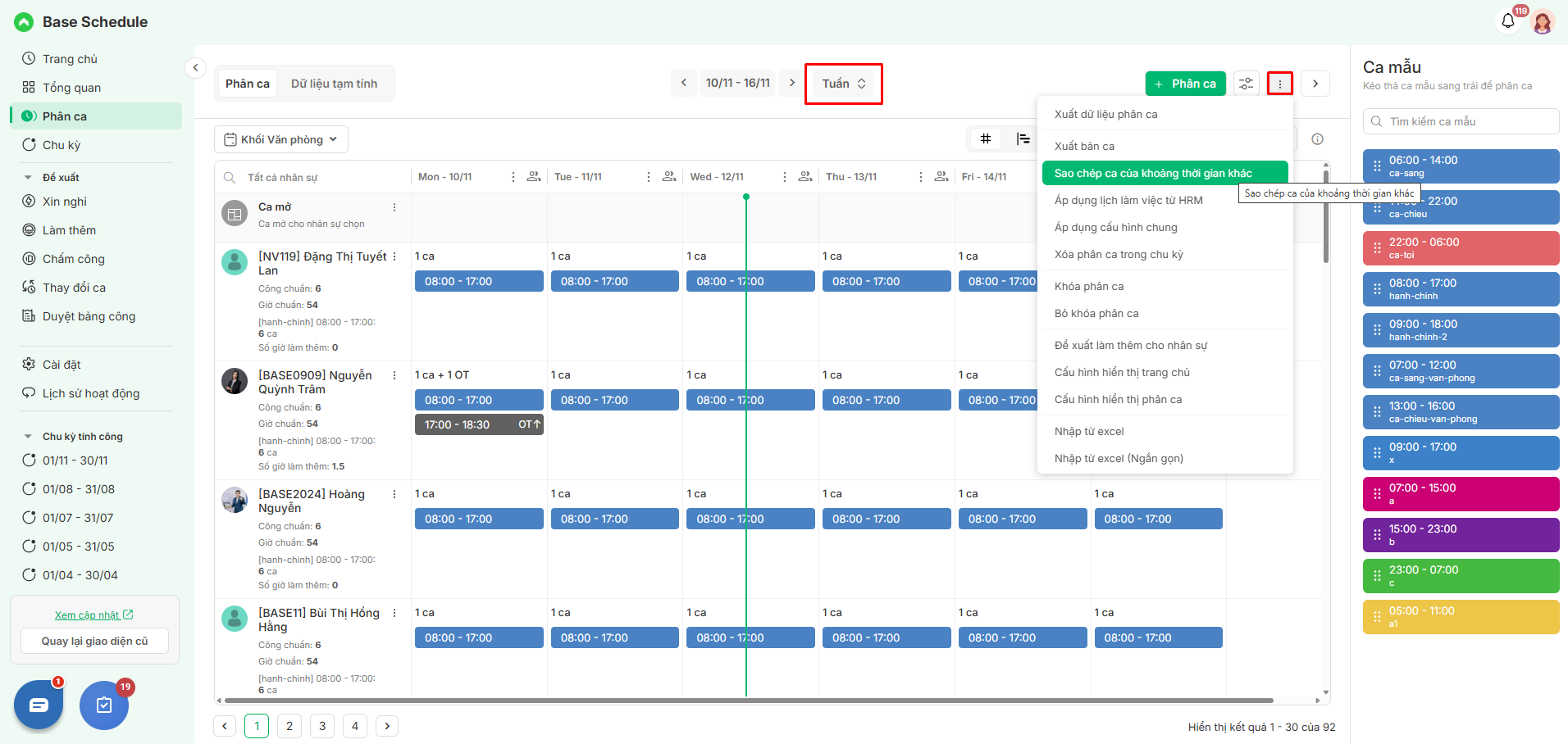Để thao tác phân ca, chỉnh sửa, sao chép ca, bạn truy cập https://schedule.base.vn/ hoặc chọn Base Schedule tại thanh menu app. Sau đó thao tác theo hướng dẫn: