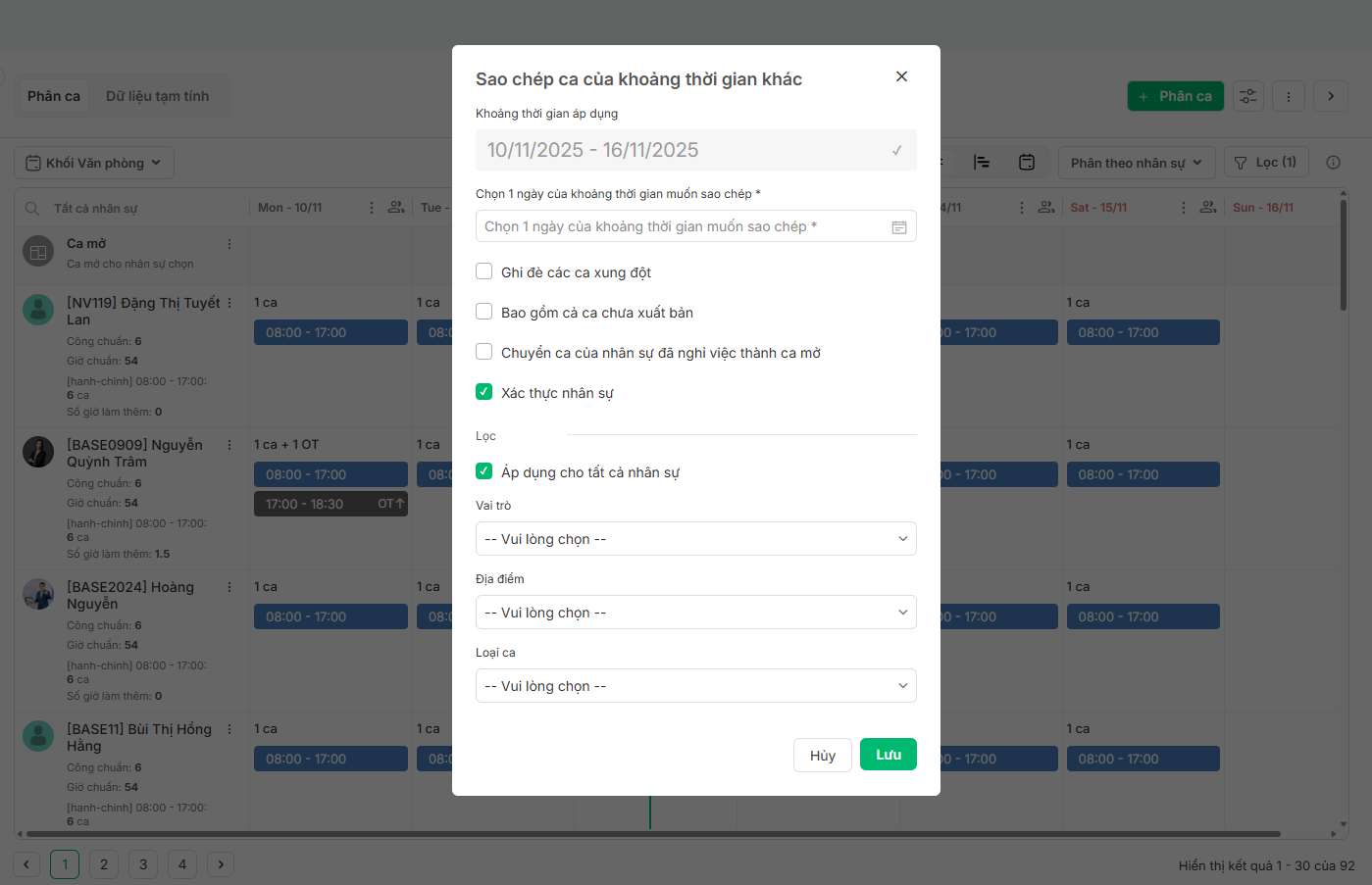 + Khoảng thời gian áp dụng: Là khoảng thời gian mà bạn muốn sao chép phân ca từ khoảng thời gian trước