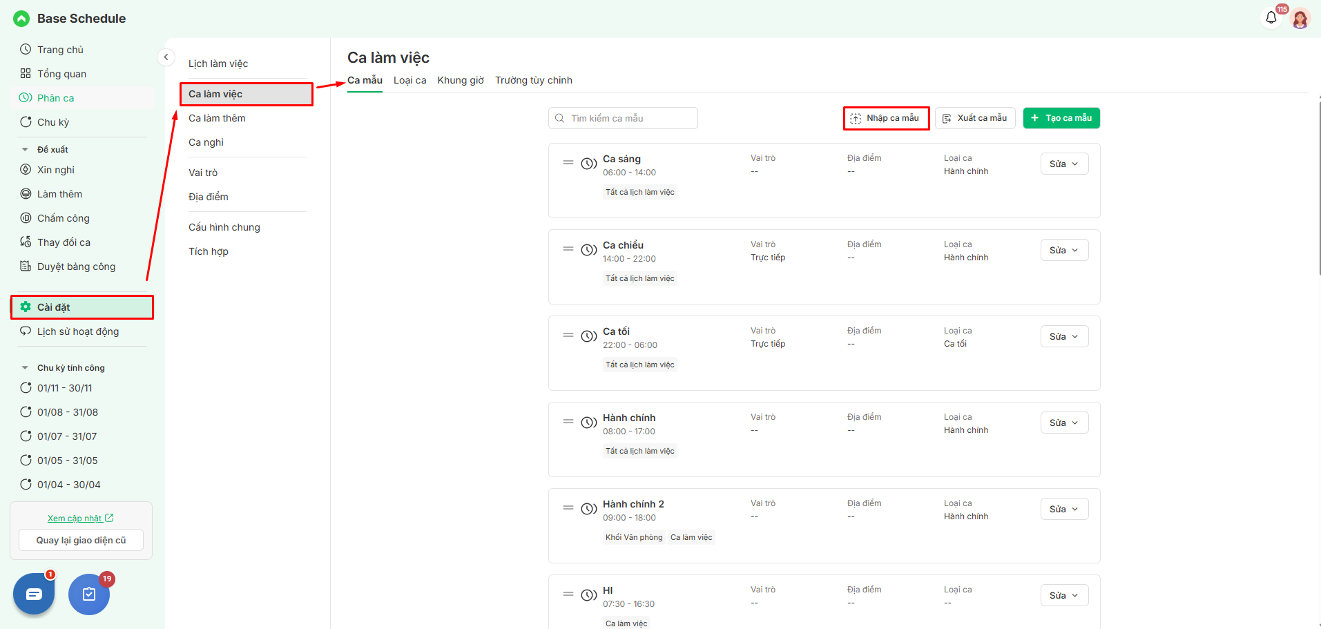 Bước 1: Bạn vào mục "Cài đặt" => chọn "Ca làm việc" => chọn "Ca mẫu", tại góc phải màn hình tích dấu mũi tên đi xuống và chọn "Nhập ca mẫu"