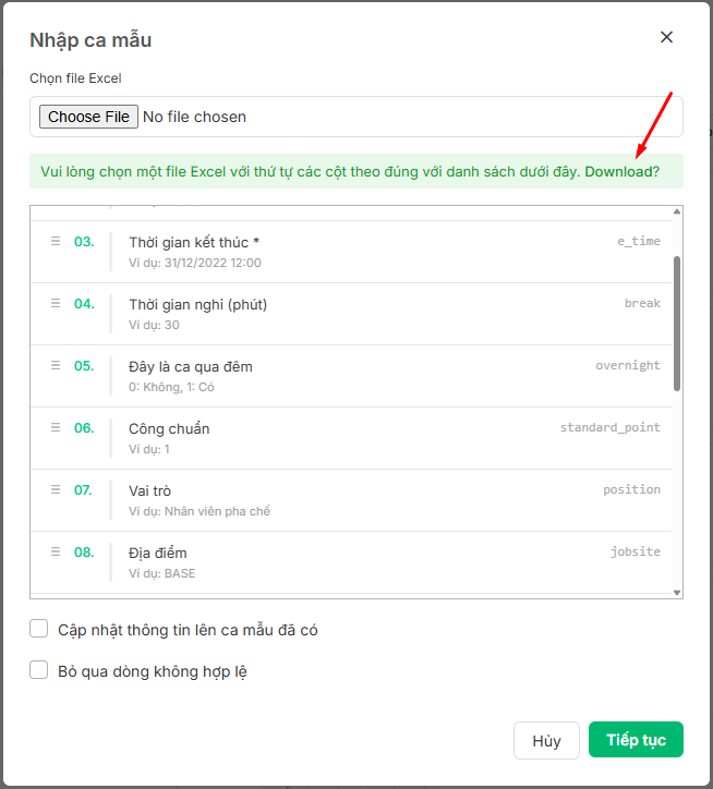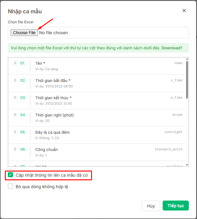 1. Hướng dẫn tạo ca mẫu bằng file excel