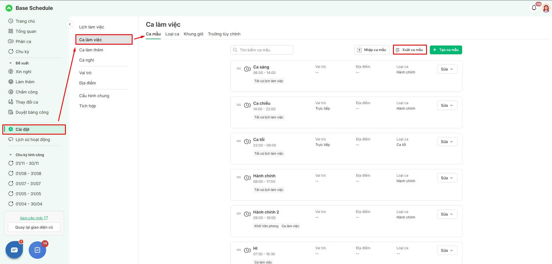 Bước 1: Bạn vào mục "Cài đặt" => chọn "Ca làm việc" => chọn "Ca mẫu", tại góc phải màn hình tích dấu mũi tên đi xuống và chọn "Xuất ca mẫu"