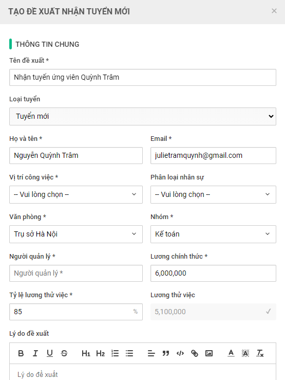 To use the feature of creating a recruitment proposal. You access the Hiring app from the app menu or the link: https://hiring.base.vn/ and follow the instructions below: